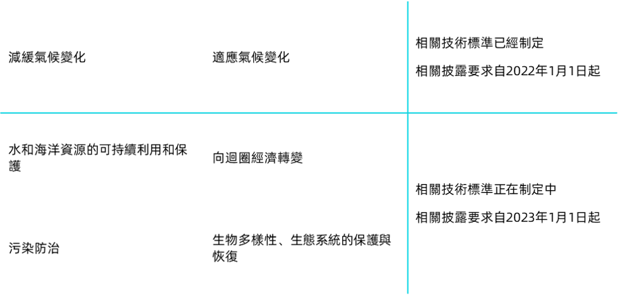 然而,目前歐盟制定的技術標準僅用於指導減緩氣候變化和適應氣候變化。 從2022年1月1日起,將要求對經濟活動如何有助於減緩氣候變化和適應氣候變化的分類進行相關披露。 其餘四個目標的技術標準正在制定中,從2023年1月1日起需要披露相關信息。